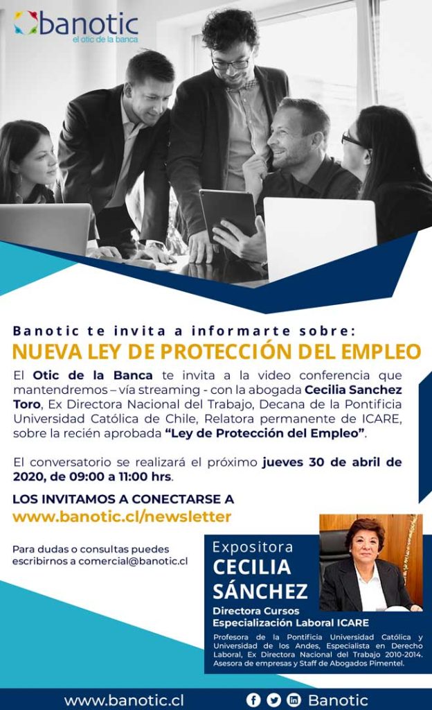 El Otic de la Banca realizó el pasado 30 de abril una video conferencia – vía streaming – con la abogada Cecilia Sánchez Toro, Ex Directora Nacional del Trabajo, Decana de la Pontificia Universidad Católica de Chile, relatora permanente de ICARE, sobre la recién aprobada “Ley de Protección del Empleo” Para revivir el seminario los […]