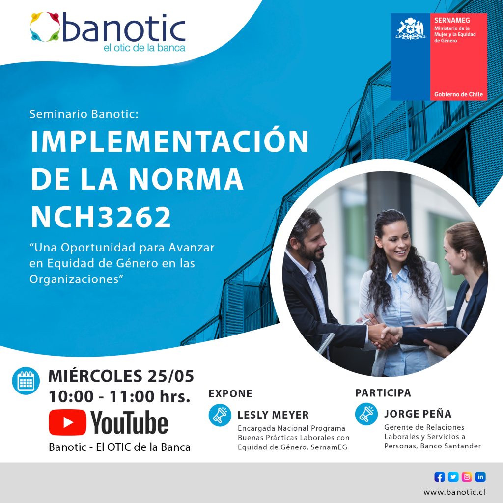 Banotic junto al Servicio Nacional de la Mujer y la Equidad de (SernamEG) realizaron el pasado 25 de mayo el Seminario: Implementación de la Norma NCH3262:2012 “Una Oportunidad para Avanzar en Equidad de Género en las Organizaciones”, el cual contó con la participación de Lesly Meyer, Encargada Nacional Programa Buenas Prácticas Laborales con Equidad de […]