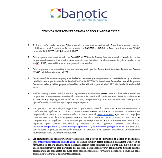 1. Se llama a la Segunda Licitación Pública, para la ejecución de actividades de Capacitación para el trabajo, establecidas en el Programa de Becas Laborales de BANOTIC, el OTIC de la Banca y autorizado por SENCE mediante Ord. N°729 del 24 de abril del 2023.
