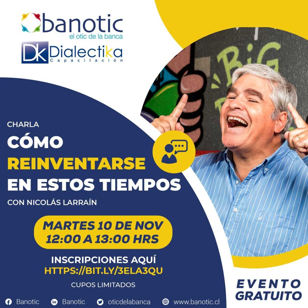 El pasado 10 de noviembre Banotic pensando en el bienestar de vuestros colaboradores y colaboradoras y en la importancia de tener una buena salud mental, presentó en conjunto con Dialectika Capacitación la Charla: “Cómo Reinventarse en estos Tiempos”, presentada por el conductor, locutor de radio y empresario chileno Nicolas Larraín.