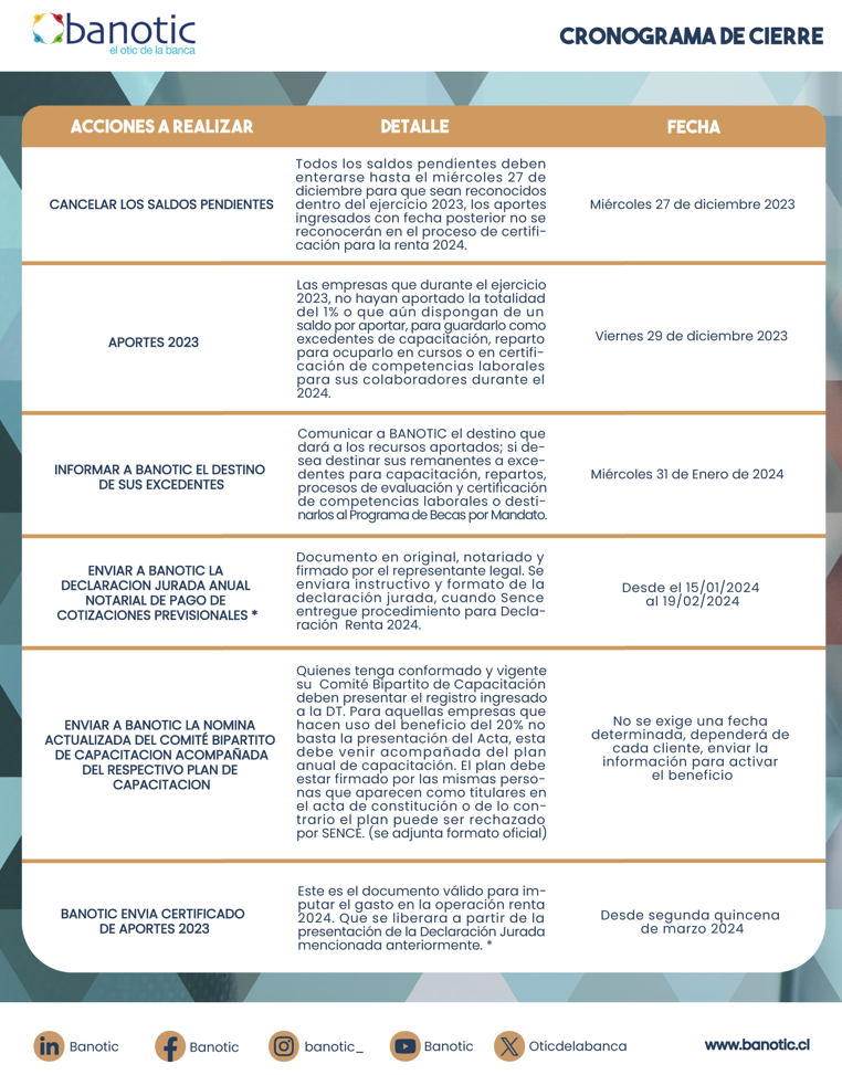 Se acerca fin de año, y como siempre Banotic te recuerda las etapas y fechas del proceso de cierre año 2023, para efectos de la correcta imputación de la Franquicia Tributaria de Capacitación.