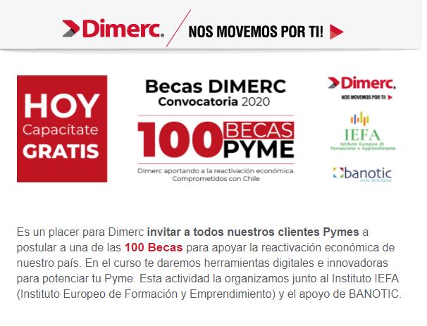 El pasado 16 de octubre Empresas Dimer en conjunto con Banotic abrió una convocatoria para postular a una de las 100 becas de capacitación enfocadas en entregar a la micro, pequeña y mediana empresa herramientas digitales, que les permitan aumentar sus ventas, bajar sus costos y mejorar la relación con sus clientes y proveedores, utilizando las tecnologías digitales.