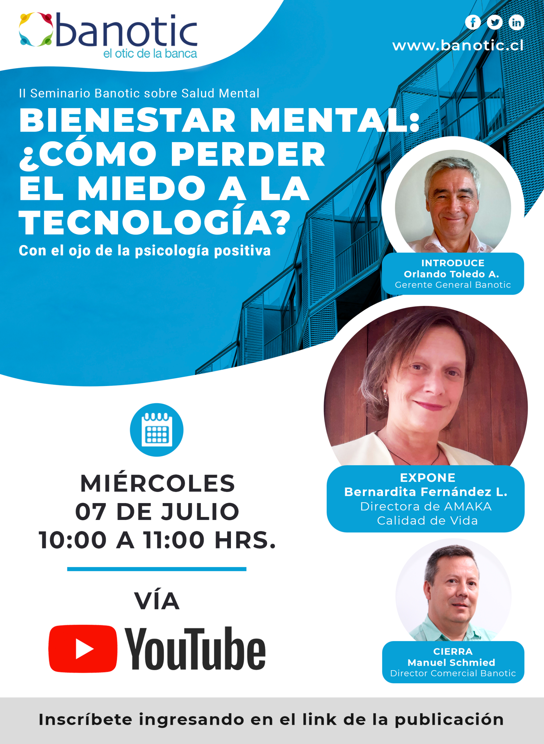 Banotic, pensando en el bienestar de sus colaboradores en general y en la importancia de tener una buena salud mental tiene el agrado de invitarlos al II Seminario sobre Salud Mental: ¿Cómo perder el miedo a la tecnología? Desde el ojo de la psicología positiva, presentado por Bernardita Fernández, Directora de Amaka Calidad de Vida, el cual se realizará el miércoles 07 de julio, de 10:00 a 11:00 a.m. vía nuestro canal de Youtube @Banotic -El Otic de la Banca. Aprovechamos de indicarle que la actividad no tiene costo asociado
