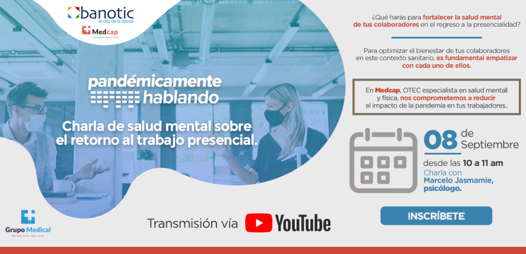 Banotic y Medcap, pensando en los nuevos desafíos que presenta el retorno progresivo al trabajo presencial tiene el agrado de invitarlos al webinar “Pandémicamanente Hablando: Charla de Salud Mental Sobre el Retorno al Trabajo Presencial” que será presentado por el psicólogo Marcelo Jasmamie, la cual se realizará el próximo miércoles 8 de septiembre, de 10:00 a 11:00 a.m. vía nuestro canal de Youtube @Banotic -El Otic de la Banca. Aprovechamos de indicarle que la actividad no tiene costo asociado.