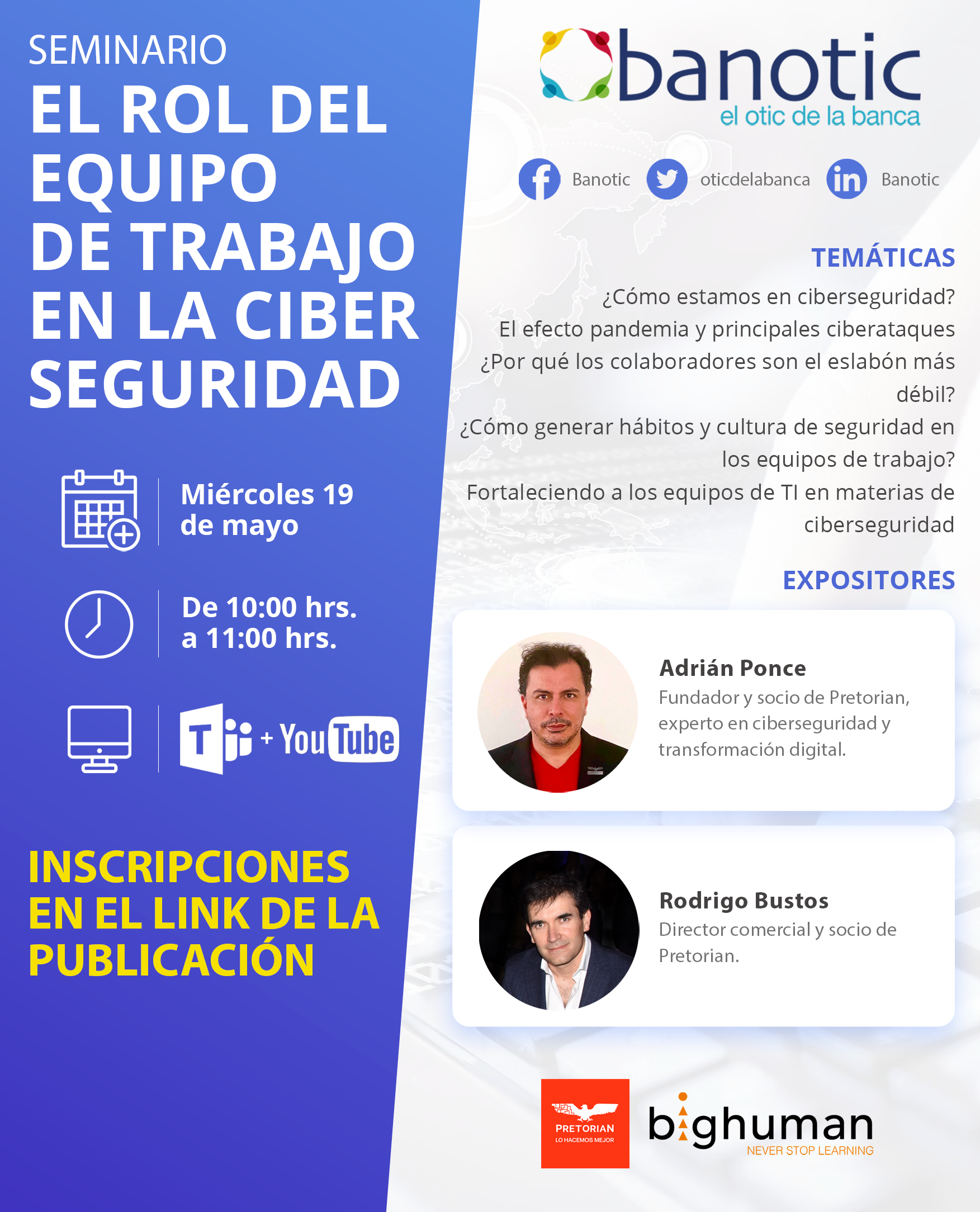 En Banotic queremos agradecer a los asistentes que participaron en nuestro “Seminario: El Rol del Equipo de Trabajo en la Ciberseguridad” organizado junto a Big Human y Pretorian. La instancia permitió reconocer la importancia de la ciberseguridad debido a que abarca todo lo relacionado con la protección de nuestros datos personales, información de identificación personal, información de salud, propiedad intelectual, datos y sistemas de información gubernamentales y de la industria contra el robo y el daño por parte de ciberdelincuentes.