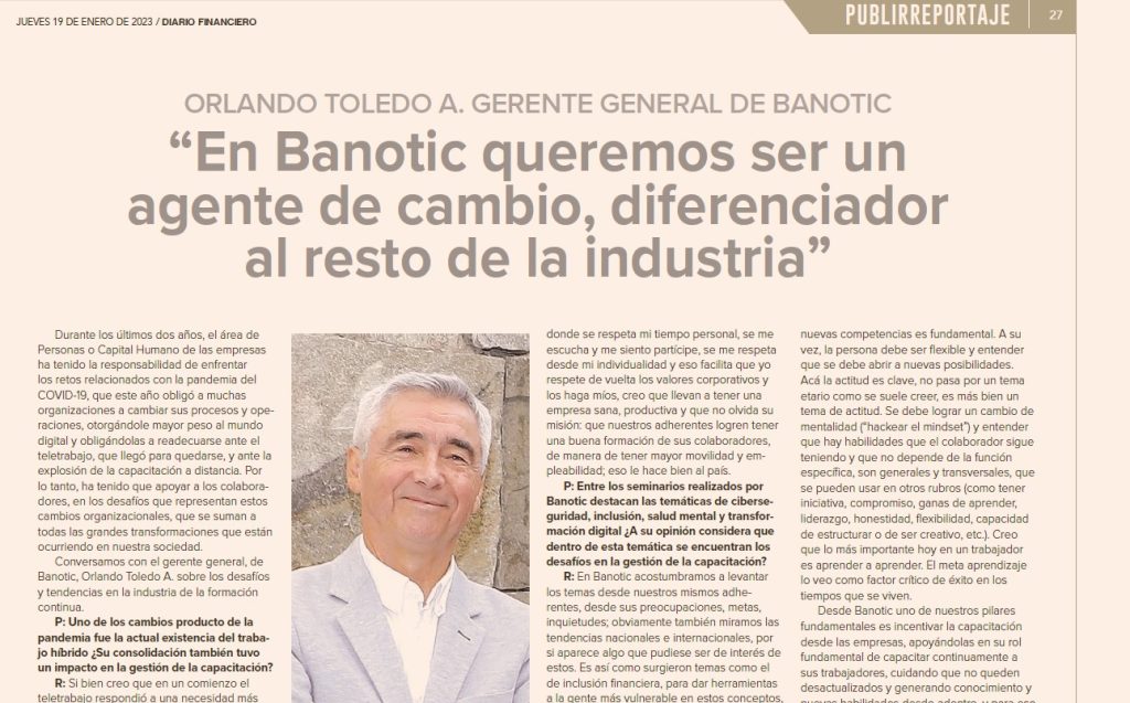 En entrevista con el Diario Financiero, nuestro Gerente General, Orlando Toledo A. realiza una reflexión sobre los desafíos que presenta la formación del Capital Humano en 2023