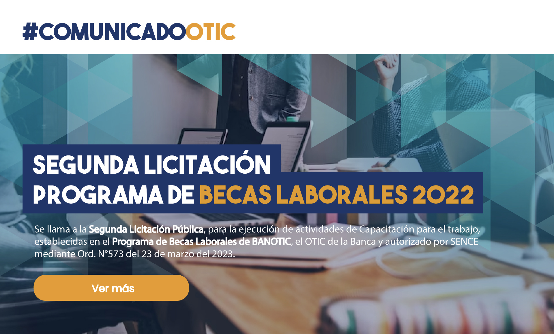 1. Se llama a la Segunda Licitación Pública, para la ejecución de actividades de Capacitación para el trabajo, establecidas en el Programa de Becas Laborales de BANOTIC, el OTIC de la Banca y autorizado por SENCE mediante Ord. N°573 del 23 de marzo del 2023.